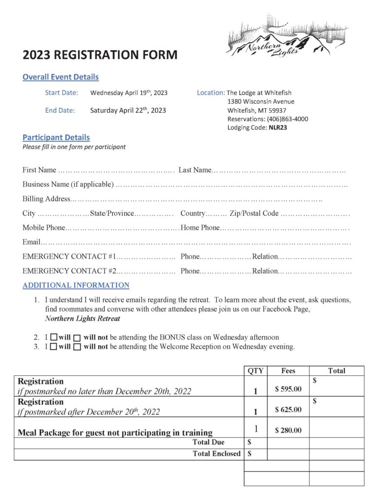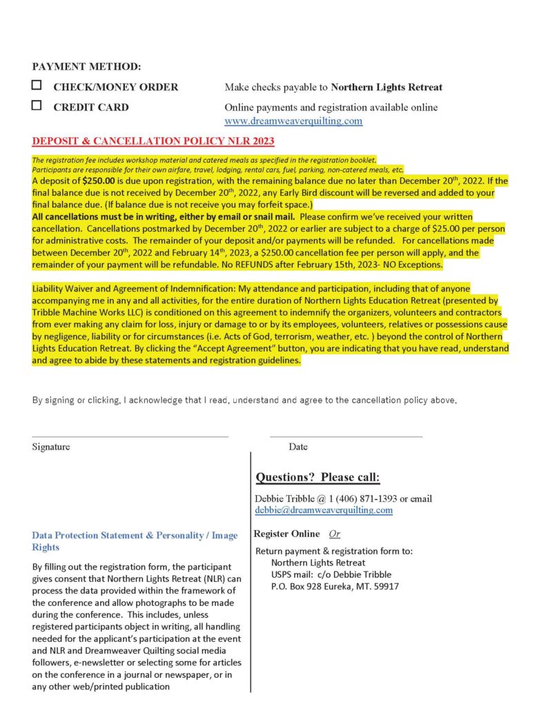 This form works best filled out on a computer. If using a phone or tablet, print form, fill, and scan . Email to debbbie@dreamweaverquilting.com. Or mail to Debbie Tribble c/o Northern Lights Retreat, PO Box 928, Eureka, MT 59917. Make sure to use the payment button at the bottom of the page to complete your registration. Registration is not complete until payment is received.