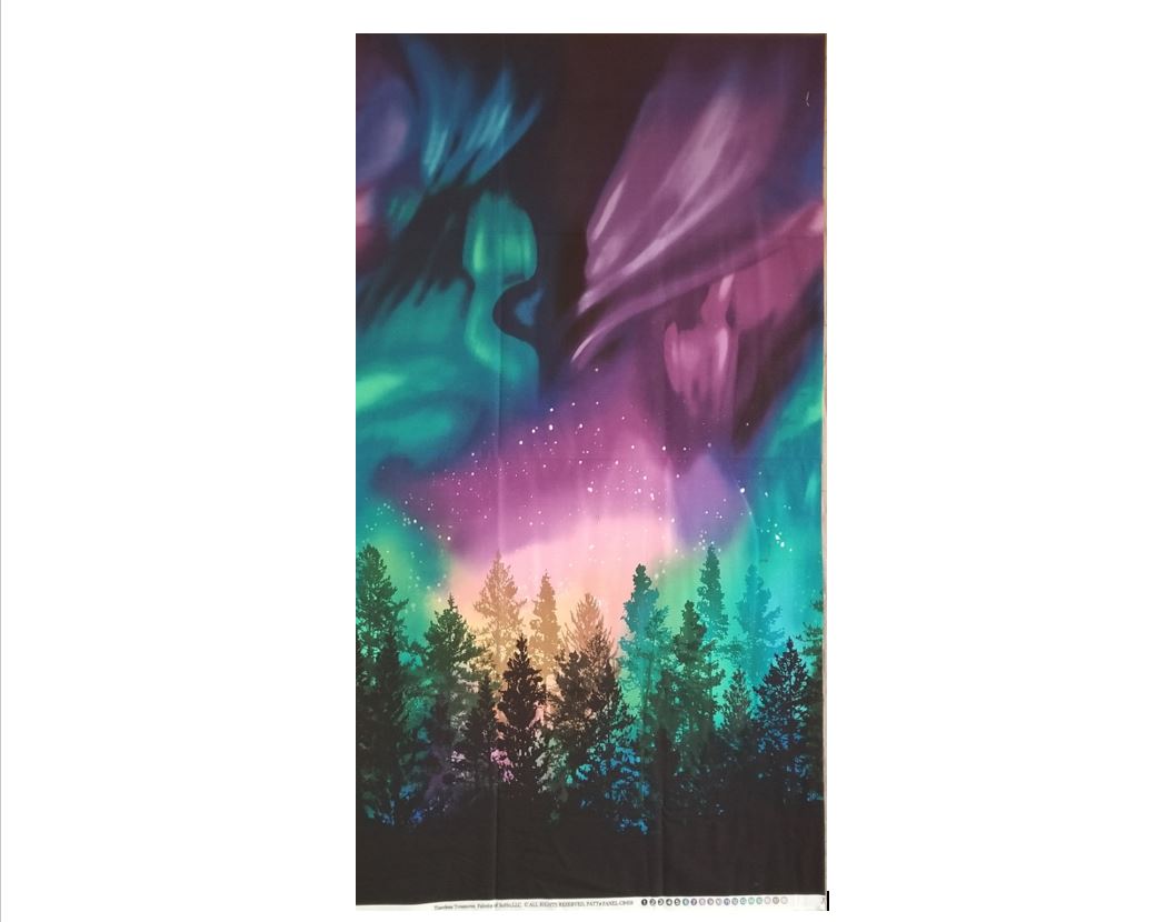 Beautiful Evergreen trees are graced by the Northern Lights in this Timeless Treasures panel. Measuring 23X44. This panel is 100% cotton. Panel is one of the options for the Northern Lights Retreat Quilt Challenge.
